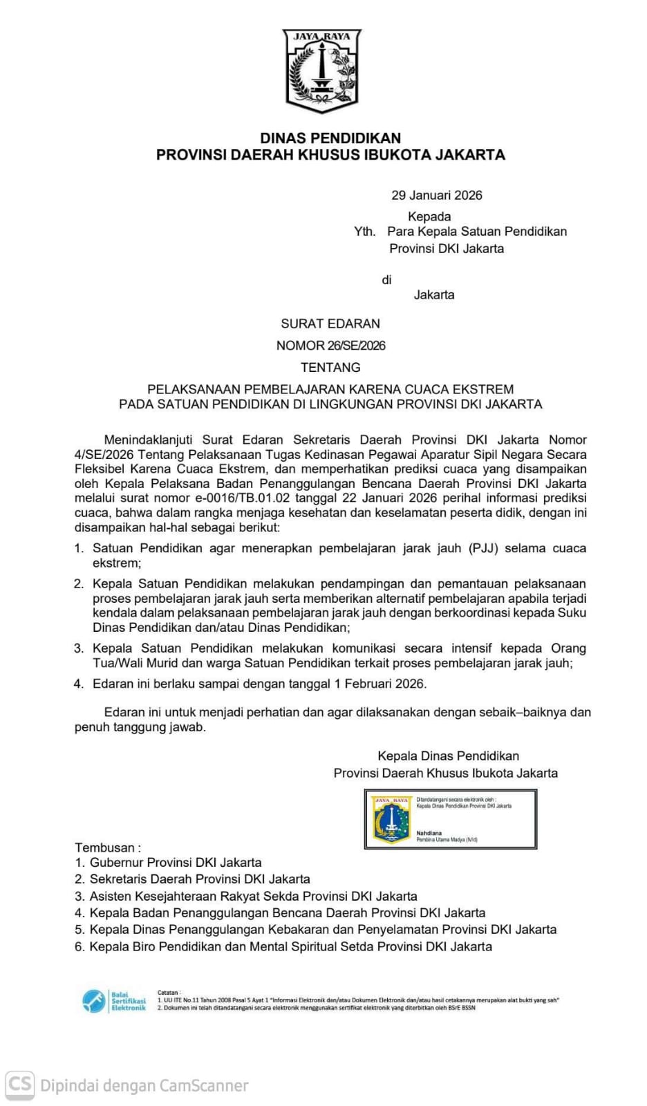 Berita Terbaru 30 Januari 202630 Januari 2026| Admin WebAdmin Web| 0 Comments| 06:03 SE Dinas Pendidikan Jakarta: Pelaksanaan Pembelajaran Karena Cuaca EkstremSE Dinas Pendidikan Jakarta: Pelaksanaan Pembelajaran Karena Cuaca Ekstrem Read MoreRead More